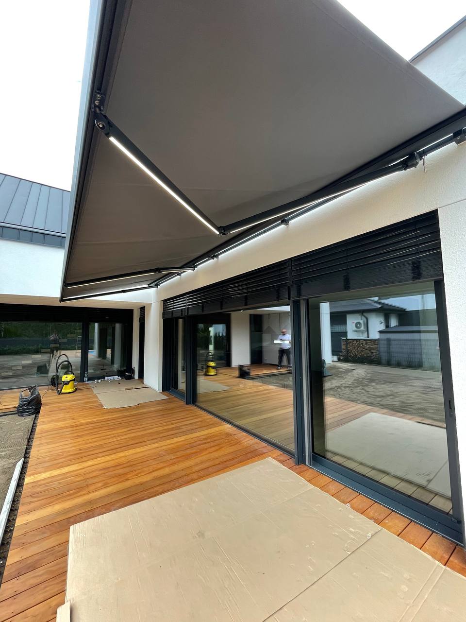 Osłony tarasów i balkonów. Napęd ręczny lub elektryczny z czujnikami.